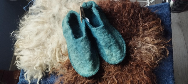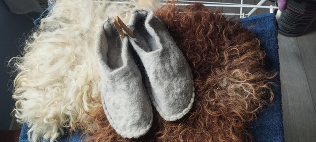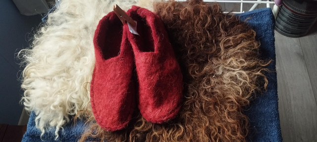 Chaussons en laine feutrée, semelle en peau tout fait main avec la laine de nos brebis !